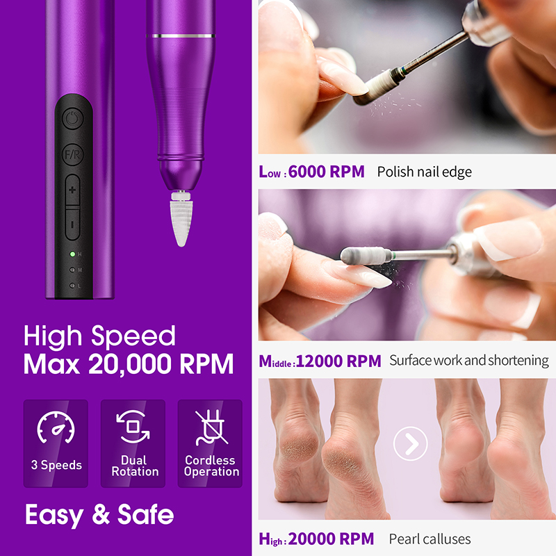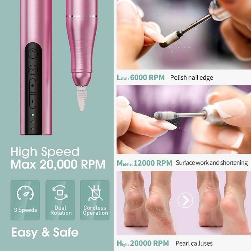 專業指甲銼設計有 6000-12000-20000 3 種速度,只需短按 + 或 - 按鈕即可增加或減少速度。易於調節速度,節省磨指甲的時間。按下 F/R 按鈕即可輕鬆改變鑽頭的方向,非常適合左撇子、美甲大師或指甲護理初學者。