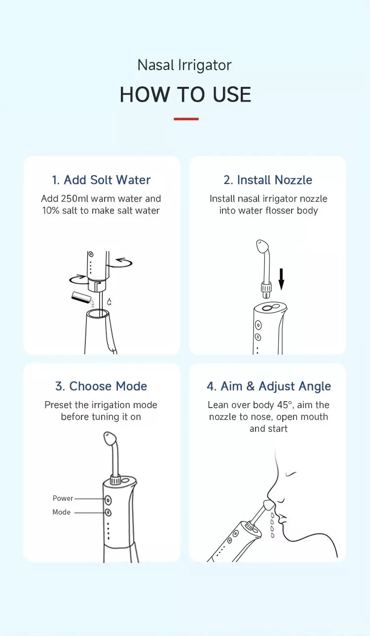 功效:電動鼻沖洗器旨在提供一致和受控的沖洗,確保徹底清潔鼻道並促進鼻竇健康。