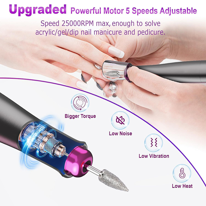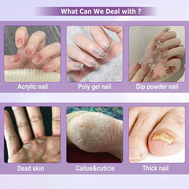 電動指甲鑽孔機升級後的強大馬達非常適合您所有的美甲和修腳需求,包括去除丙烯酸指甲、聚凝膠指甲、甲蟲凝膠、浸粉指甲、角質層、死皮、老繭和厚指甲。