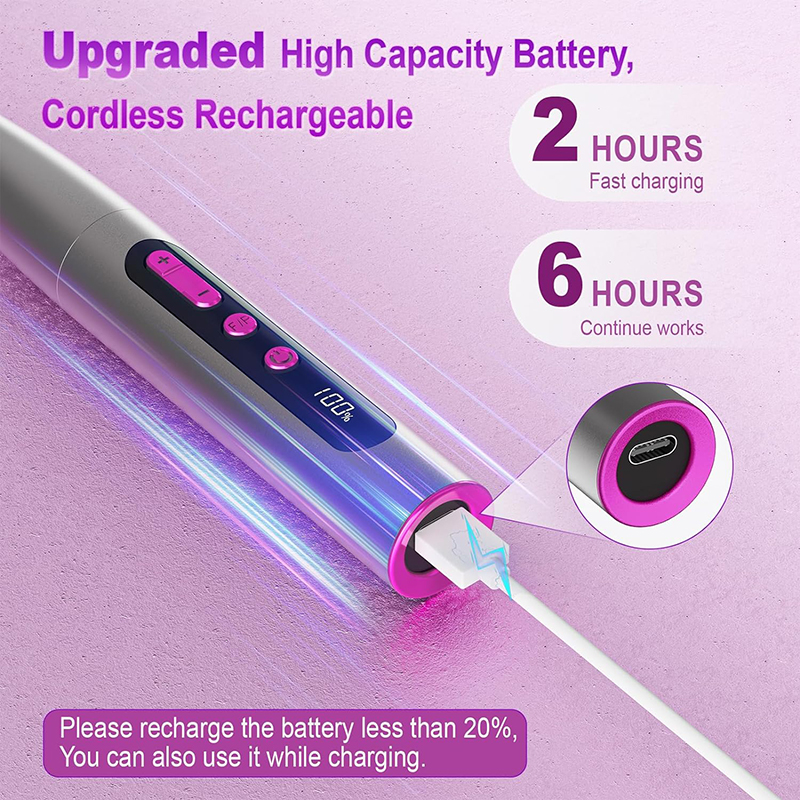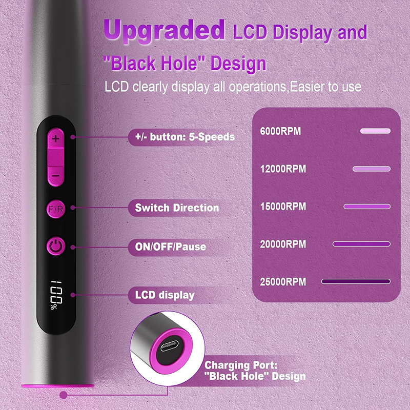 電動指甲鑽升級高容量電池,2 小時快速充電和 6 小時連續工作。電動美甲銼適用於您的 USB 電源轉接器、筆記型電腦、行動電源等。如果無線美甲鑽孔電量低於 20%,您也可以邊充電邊使用。