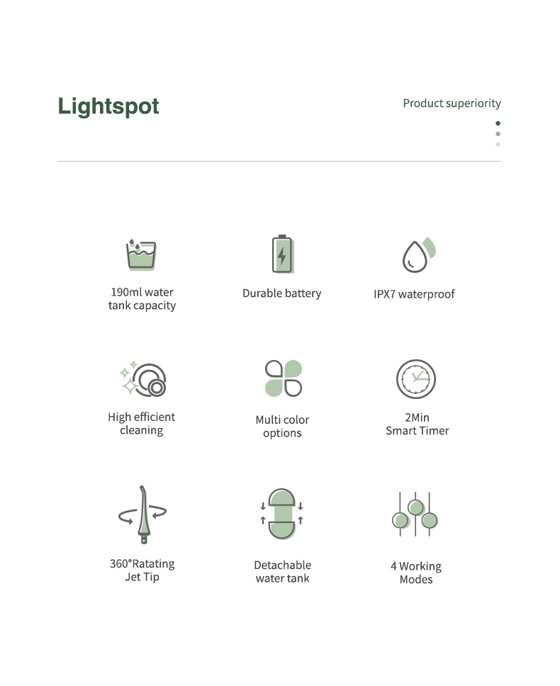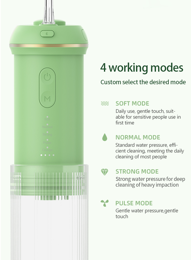 強力深層清潔:水牙線採用最新脈衝技術,提供 4 種模式,壓力範圍在 30-90 Psi 之間,脈衝頻率為 1400-1800 次/分鐘,提供高強度水流,可清除 99.99% 的污垢牙齒拉傷,專為牙周炎設計的牙套。