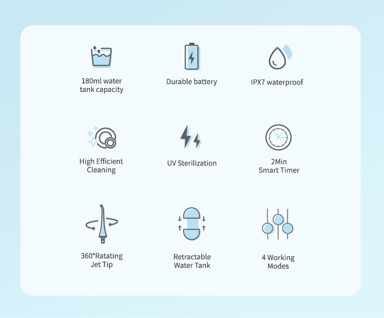 這款水牙線牙籤以每分鐘 1400-1800 次的速度提供高水壓脈衝,有效去除 99.9% 的牙菌斑,實現深層牙齒清潔。這款水牙線牙籤可按摩牙齦,促進血液循環,解決口臭、矯正牙齒等口腔問題