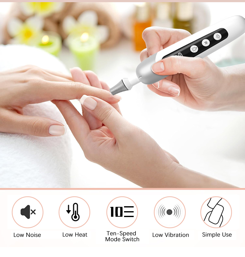 - 無線且可充電:無線電動指甲鑽非常適合旅行,可提供令人印象深刻的 10 小時操作時間。一款方便的修腳工具,可滿足您的足部和所有美甲需求。我們的指甲銼適用於天然指甲、壓克力指甲、凝膠指甲和浸粉指甲