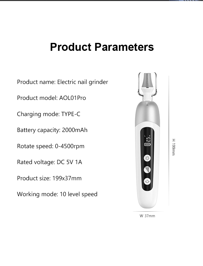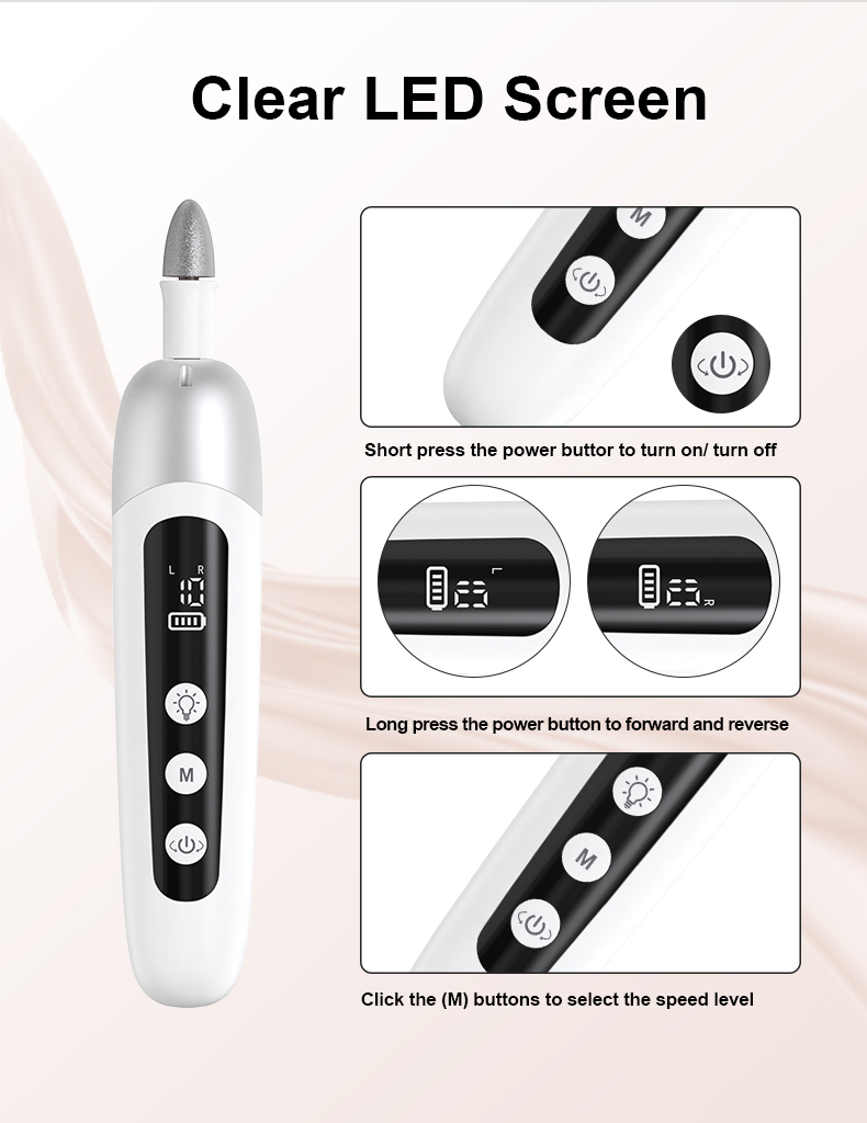 - 創新的 LED 顯示器:輕鬆無縫導航所需的設定。 LED 顯示器指示電池狀態、速度偏好和旋轉設置,以便輕鬆操作。電動指甲銼機還配備了整合式 LED 燈,可以照亮手和腳的區域