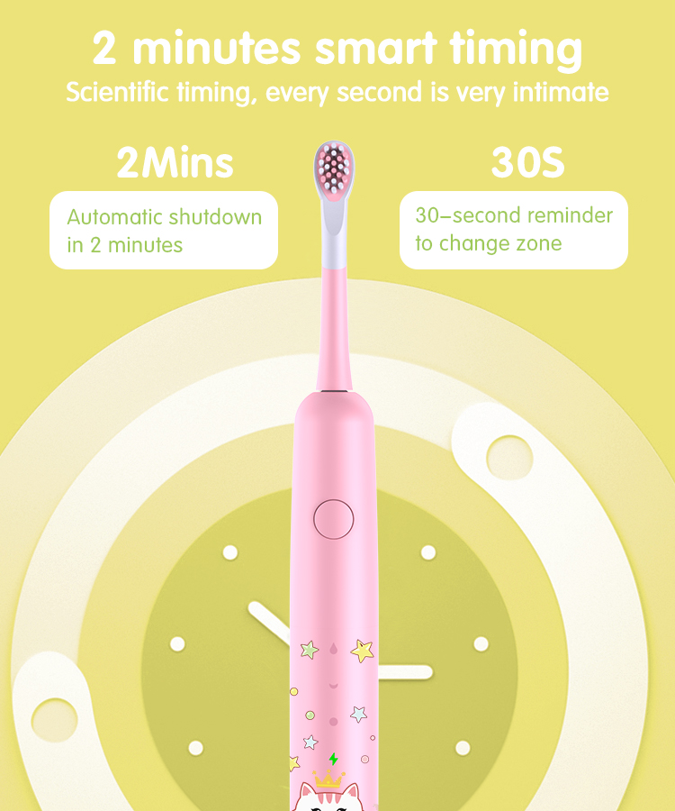 - 自動定時器:這款電子牙刷內建 2 分鐘智慧定時器,可鼓勵您的孩子延長刷牙時間,養成良好的刷牙習慣並減少蛀牙。