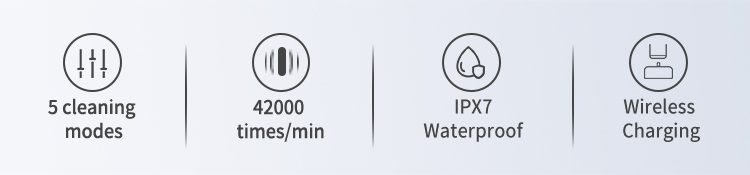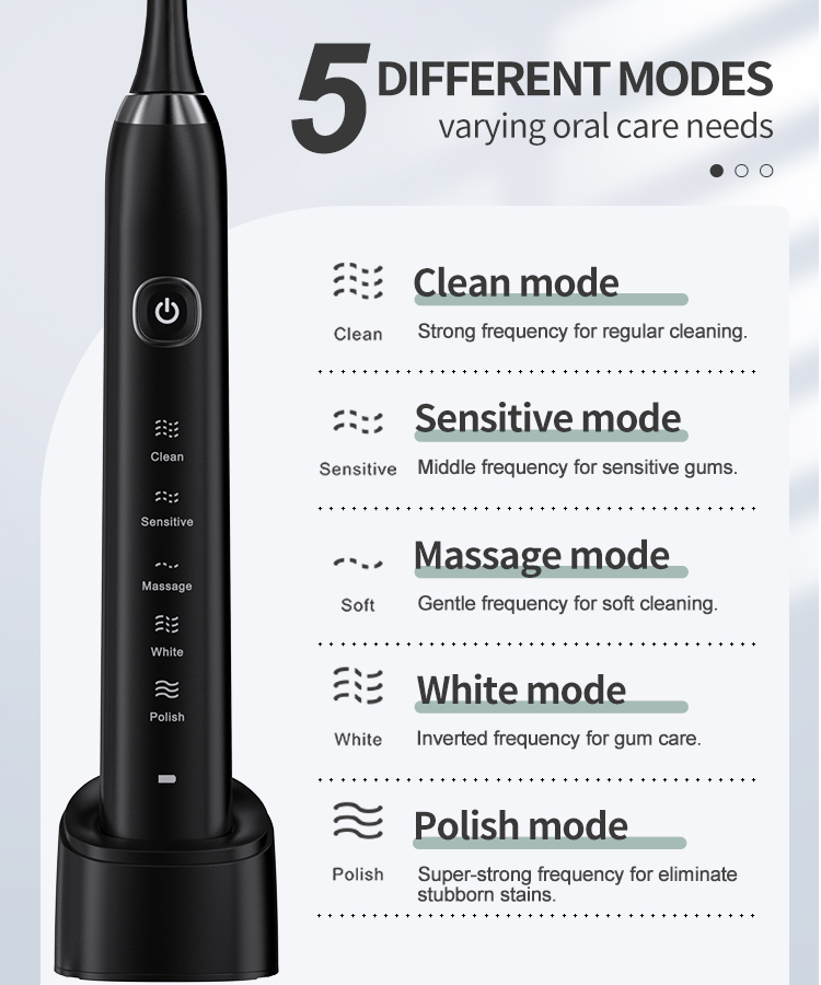 - 5種高性能刷牙模式- 清潔(溫和)、美白(強力)、拋光(強反轉頻率)、溫和(溫和反轉頻率)和敏感(柔和),以適應牙齦牙齒的不同狀況,因此您可以選擇不同的模式根據您的喜好和牙醫的建議。
